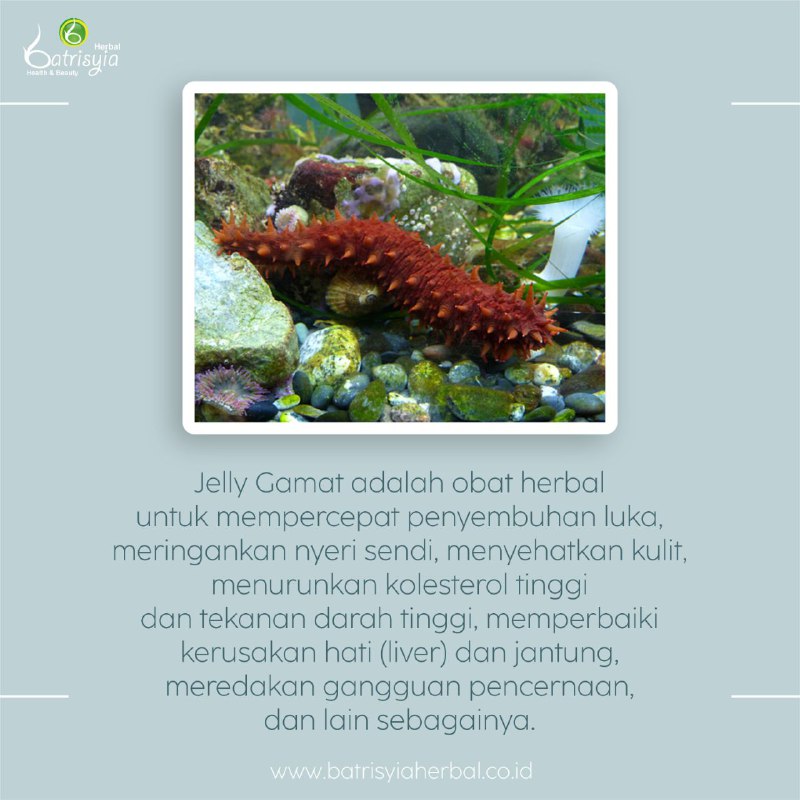 Tahukah kamu? Jelly Gamat terbuat dari ekstrak timun laut atau yang lebih dikenal dengan teripang. Menurut berbagai penelitian, teripang mengandung beragam nutrisi, seperti vitamin A, vitamin B1 (tiamin), B2 (riboflavin), dan vitamin B3 (niacin). Selain itu, teripang juga mengandung berbagai mineral, seperti zat besi, seng, magnesium, dan kalsium. Banyaknya kandungan nutrisi baik dalam teripang, membuat Jelly Gamat dipercaya memiliki berbagai manfaat kesehatan. Nah, Batrisyia Lovers tahukan bahwa Batrisyia Herbal selalu memanfaatkan kebaikan dari alam untuk kita, salah satunya adalah yang mengandung gamat kolagen. Selain dari bahan alami Batrisyia Herbal juga telah dipercaya dan teruji secara klinis maupun higienis.