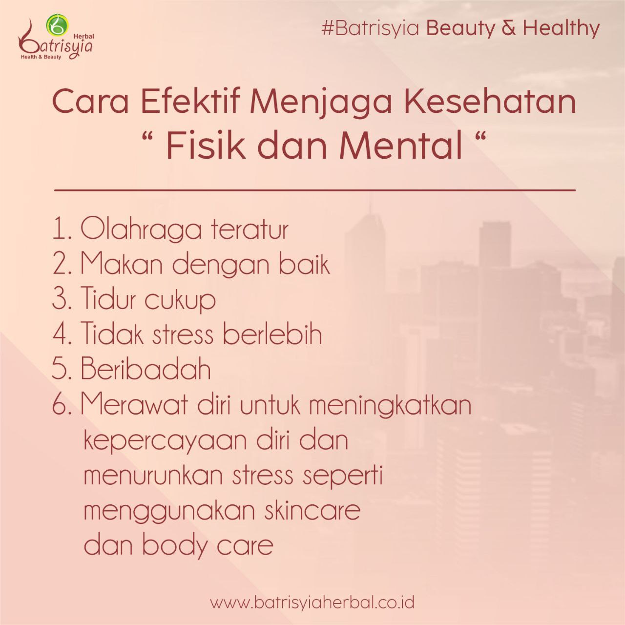 Batrisyia Lovers, agar aktivitas tetap berjalan lancar dan pikiran pun tenang kita butuh menjalankan aspek penting dalam menjaga tubuh agar tetap fit juga memiliki jiwa yang tenang dan tentram. Nah inilah beberapa cara sederhana yang dapat diterapkan untuk menjaga dan meningkatkan kualitas kesehatan fisik maupun mental. Salah satunya bisa dengan melakukan self care atau merawat diri sendiri seperti menggunakan skincare maupun body care lho..