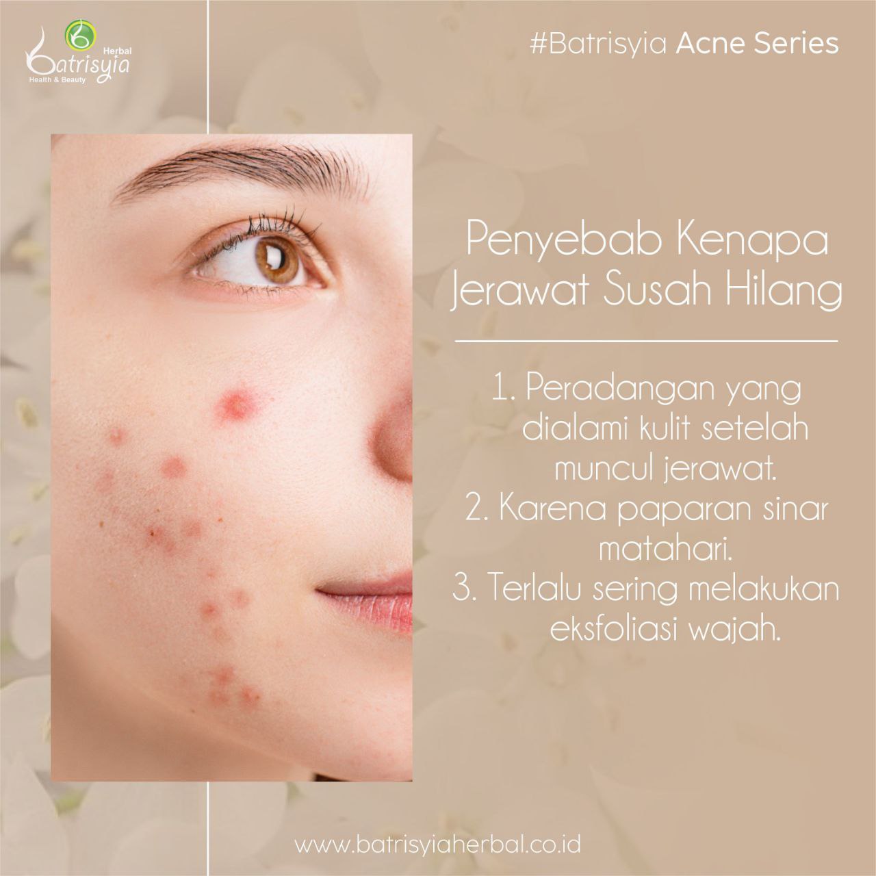 Girls cari tahu yuk, kenapa sih bekas jerawat susah hilang? 1. Akibat peradangan yang dialami setelah munculnya jerawat. Maka dari itu ketika berjerawat jangan sekali-kali kamu menyentuhnya apalagi sampai memencet jerawat yang menyebabkan jerawat jadi meradang. 2. Karena terpapar sinar matahari. Sinar matahari bisa memperparah penggelapan warna atau bikin noda bekas jerawat susah hilang. 3. Terlalu sering melakukan eksfoliasi wajah, kulit kita memang perlu kok eksfoliasi secara rutin, karena bekerja untuk mengangkat sel kulit mati di permukaan kulit hingga ke pori-pori lebih dalam dan membantu mengontrol produksi sebum. Namun, kalau terlalu sering, hasilnya malah jadi over-exfoliating dan dapat merusak skin barrier. Batrisyia Lovers itulah alasan mengapa bekas jerawat susah hilang, selain sabar saat memakai produk perawatan kulit wajahmu, kamu juga mesti memperhatikan hal-hal diatas ya